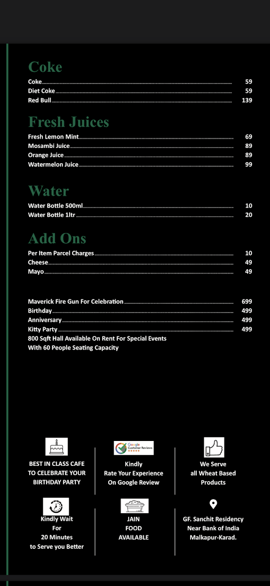 Welcome to Cafe Maverick 2.0, an inviting haven nestled on Vakhan Road in Karad, Maharashtra. If you're on the hunt for a place where ambiance meets exquisite flavors, look no further. This café encapsulates the essence of what a delightful hangout should be, with a modern yet cozy atmosphere that makes every visit feel special.